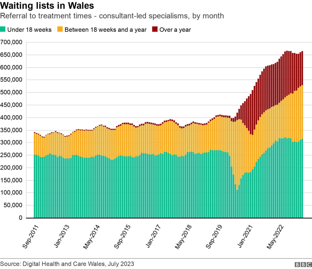 The figures show that 20.1% of patients in Wales – almost 134,000 in those consultant-led specialisms – are waiting more than a year, compared to 5.2% of patients on similar waiting lists in England.